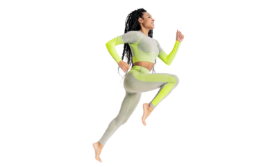 Energetic woman in sport outfit joyfully jumping on transparent background