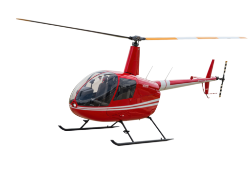 Red Robinson R44 helicopter isolated on transparent background, light general aviation aircraft PNG for transportation and travel