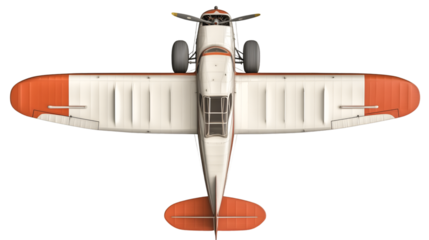 Detailed top view rendering of a vintage high wing single engine propeller aircraft featuring white fuselage and striking orange wing tips on transparent background
