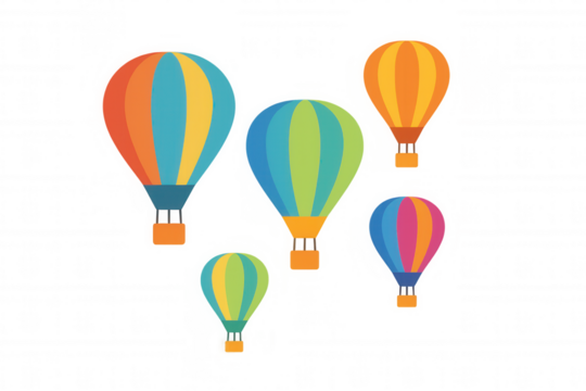 Multiple colorful hot air balloons flying, representing travel, adventure, and exploration. Flat design vector illustration with transparent background
