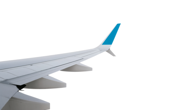 Aviation and travel airplane wing or view of the plane wing from the window of passenger seat. Airplane wing isolated on transparent background. PNG Format