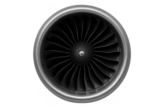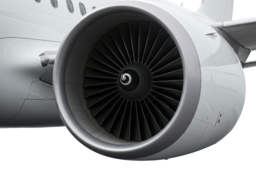 Extreme close-up of modern white jet engine intake with polished metallic fan blades and pristine fuselage, subtle motion blur, on transparent background. Concept of cutting-edge aerospace engineering
