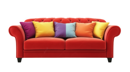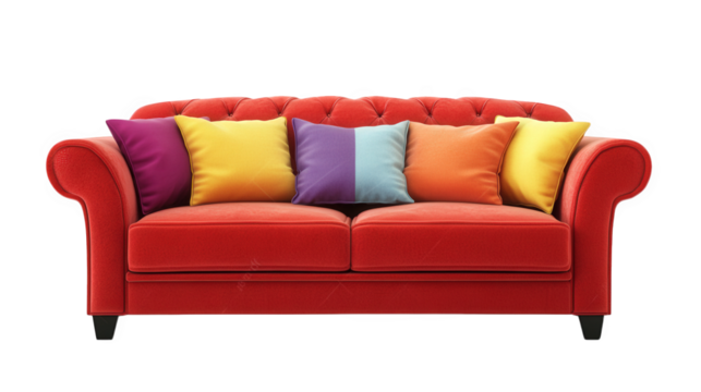vibrant red sofa adorned with an assortment of colorful pillows in shades of purple. yellow. and blue. set against a plain white background this stylish furniture piece is designed for comfort and aes