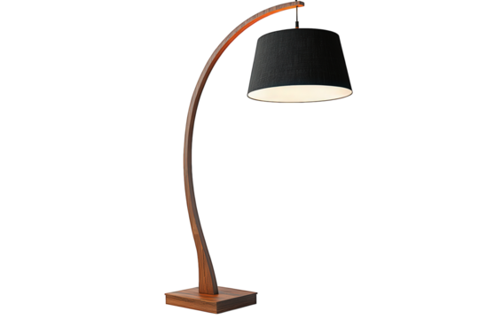 stylish floor lamp with a curved wooden base and a black fabric shade. designed to provide ambient lighting in a living space its elegant design makes it a functional decor piece that enhances the aes