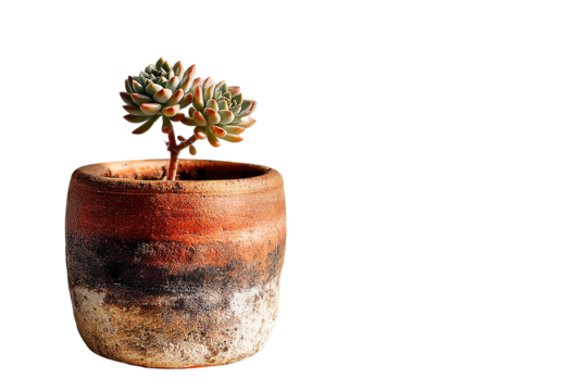 Potted succulent plant in a rustic clay pot on a white isolated background.