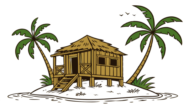 Stylized Tropical Island Hut Illustration with Palm Trees and a Sandy Beach Scene