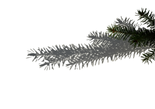 a sharp, stylized shadow of a conifer branch against a stark, high-key white studio wall, emphasizing spiky detail and clean lines with vast negative space. concept of aesthetic light geometry