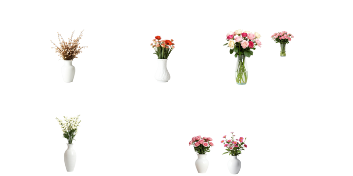 Assorted vases containing various flower arrangements isolated on a transparent background with no distractions allowing for message placement and design versatility