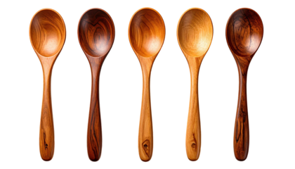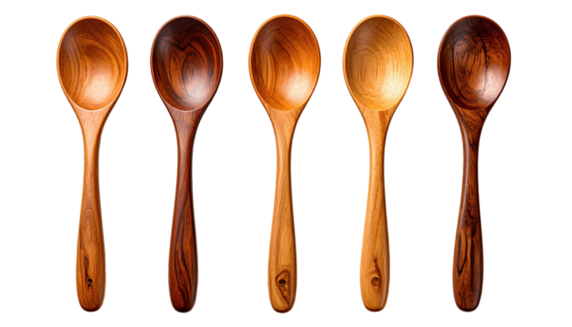 Five handcrafted wooden spoons arranged in a row, each exhibiting unique grain patterns and tones