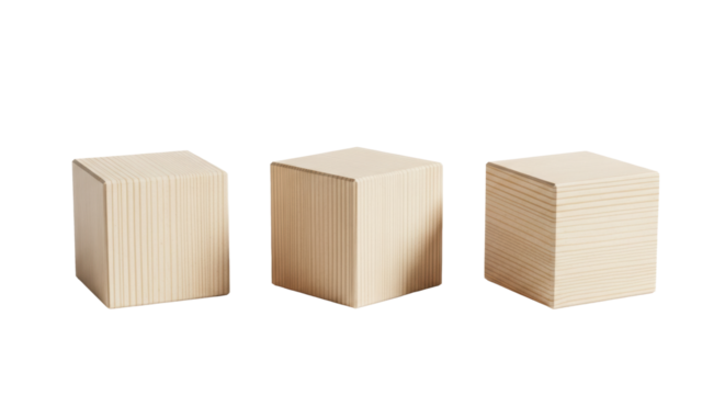 Three identical, light-colored pine wood cubes displaying detailed grain texture, arranged precisely on a reflective white surface with soft side light. Concept of structure and perspective