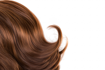 A close-up view of flowing. shiny brown hair with soft curls. its texture and movement. set against a clean white background. ideal for beauty and haircare promotions