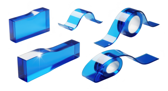 Various stylized blue adhesive tape rolls and dispensers on a white background depicting crafting supplies for creative visuals