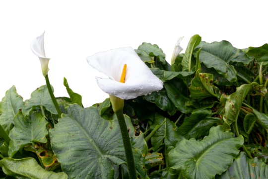 Flowers of white Calla lilies, Zantedeschia aethiopica, surrounded by lush green leaves, isolated on white background