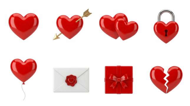 Red heart icon set including arrow, lock, balloon, envelope, gift, and broken shapes isolated. Valentine and love symbols collection.