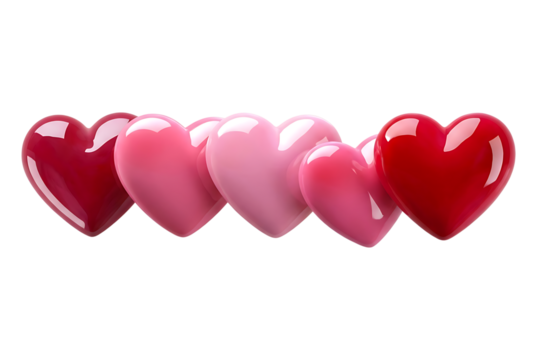 A vibrant line of glossy red and pink hearts symbolizing love, romance, and affection isolated on transparent background