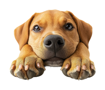 Close-up of a comfortable orange tabby cat lying down isolated on a transparent background png file.