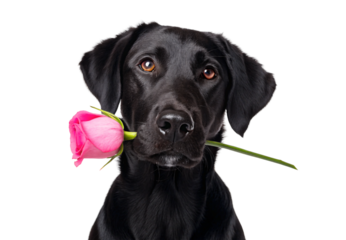 Black labrador holding pink rose in mouth with expressive eyes, isolated on a transparent background