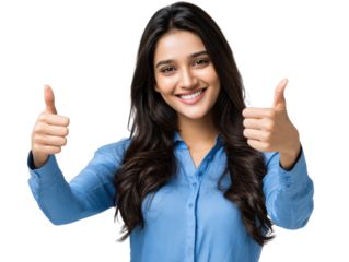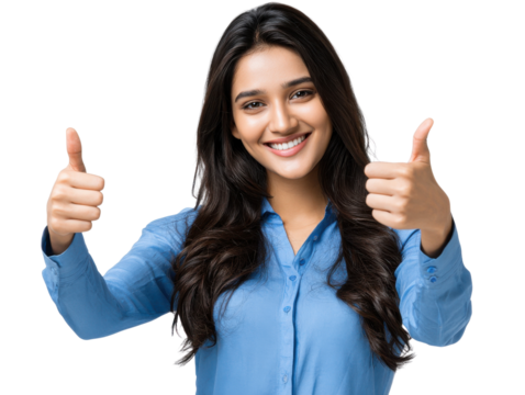 Confident Woman Giving Thumbs Up: A radiant woman in a blue shirt exudes positivity and approval, flashing a warm smile while giving a thumbs-up gesture, symbolizing agreement and well-being.