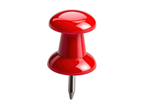 Orange shiny pushpin standing on metal pin, ideal for marking locations or important information. Transparent background included