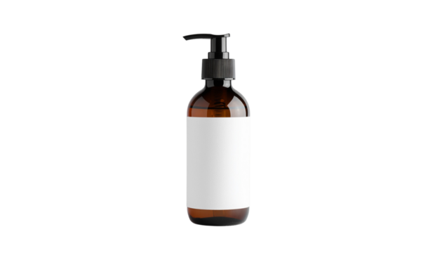 Amber glass bottle with a black pump dispenser and a white label affixed to the front of the container no background