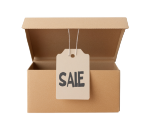 A Brown Cardboard Box with an Open Lid and a Sale Tag, Perfect for Promotional Events and Retail Discounts Offering Limited-Time Deals, png, isolated on transparent background