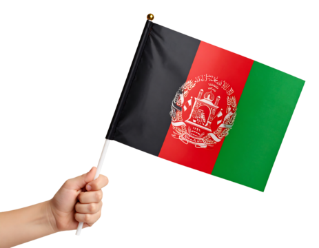 A hand holds the national flag of Afghanistan, featuring the tricolor stripes and the country's emblem.