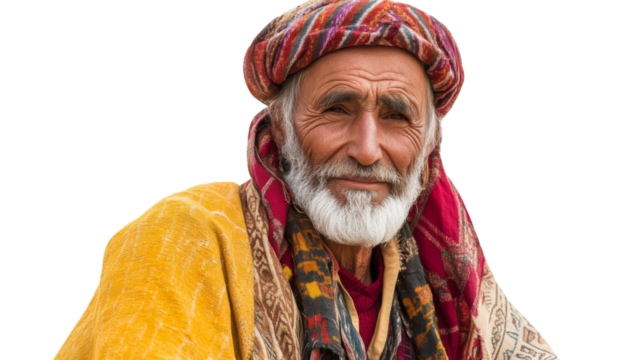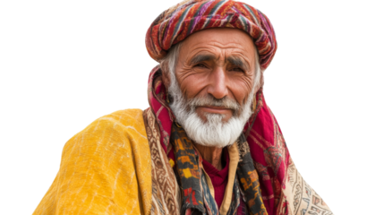 Portrait of smiling senior afghan man wearing traditional clothing on transparent background