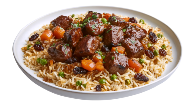 Kabuli pulao, pilat, the national dish of Afghanistan, rice with meat on white background