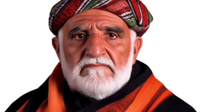 Senior Afghan man with beard and turban portrait, cut out transparent