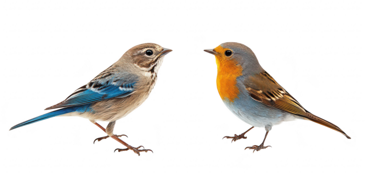 Two colorful birds facing each other against a plain white background. their plumage and intricate details. ideal for nature enthusiasts and wildlife photography