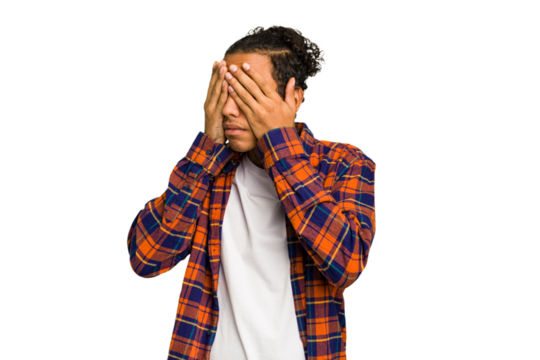 Young caucasian woman cutout isolated afraid covering eyes with hands.