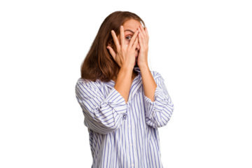 Young caucasian woman cutout isolated blink through fingers frightened and nervous.