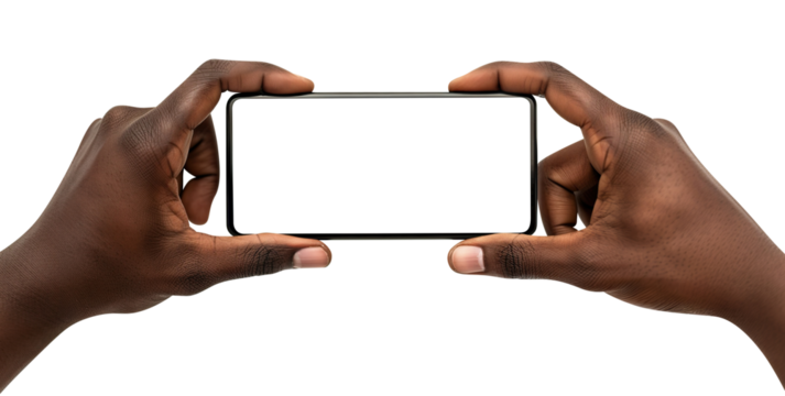 Holding smart phone with blank screen isolated on transparent or white background