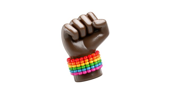 3D render of African American fist with colorful LGBTQ pride bracelet icon on white background