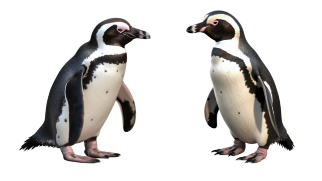 Three African penguins standing in a row on a transparent background PNG image isolated wildlife file