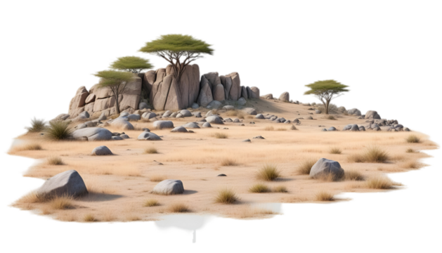 Savannah landscape featuring large rocky stone formations with grass isolated on white background. Suitable for marketing or business purposes