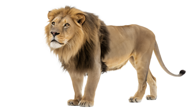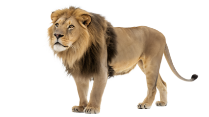 Photograph of a majestic lion with a flowing mane, standing proudly against a transparent background.
