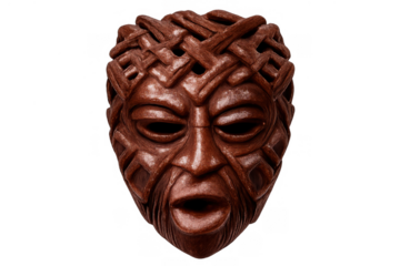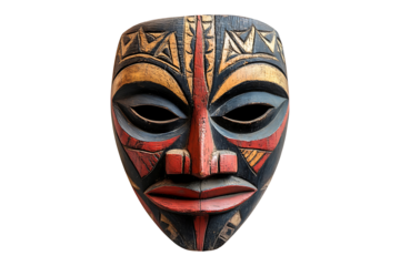 Hand-carved wooden mask showing intricate details and ethnic patterns, a symbol of rich african culture and tribal history, on transparent background