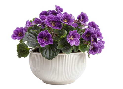 African violet flower plant with white ceramic pot isolated on transparent or white background