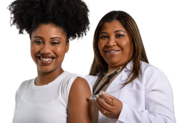 health professional vaccinating a teenage girl on the arm looks at the camera and smiles, white background