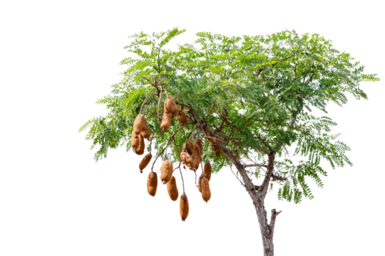 A sausage tree (Kigelia africana) displays numerous distinctive long, brown, pendulous, sausage-shaped fruits amidst green foliage on a plain transparent background. background removed