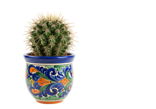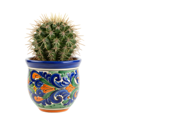 Colorful ceramic pot with a lively cactus against a black background showcasing decorative artistry
