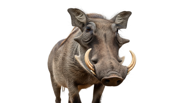 Warthog portrait headshot isolated on white background showing tusks and textured skin.