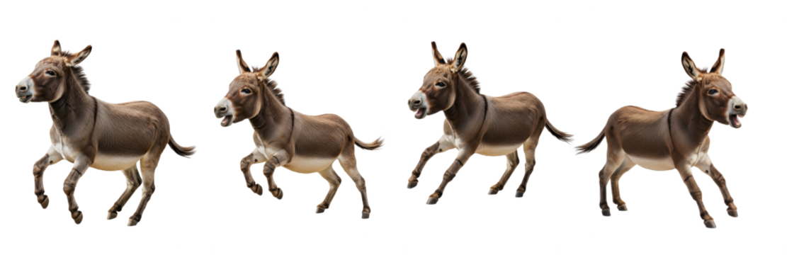 Donkey Equus africanus asinus isolated on white background foal set livestock animal walking running standing fur mammal biology photography cutout graphic high-resolution sharp focus macro detail