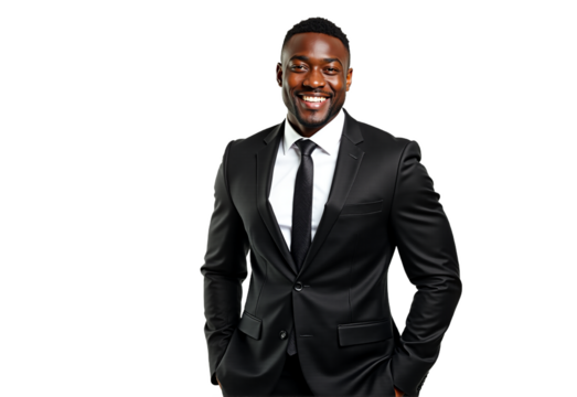 Business man portrait isolated on white transparent background, Afro businessman in suit, crossed arms, PNG