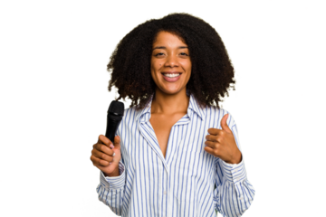 Young African American singer woman holding a microphone isolated smiling and raising thumb up