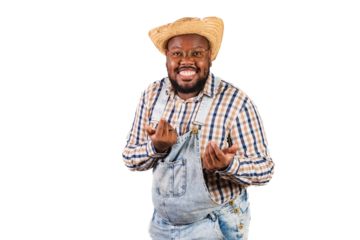 brazilian black man wearing country clothes from festa junina, festa de são joão. inviting with your hands, be very kind, come.