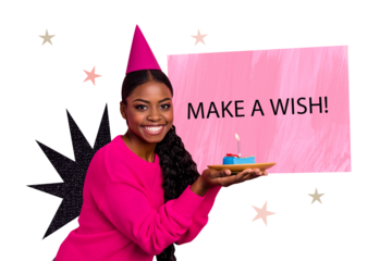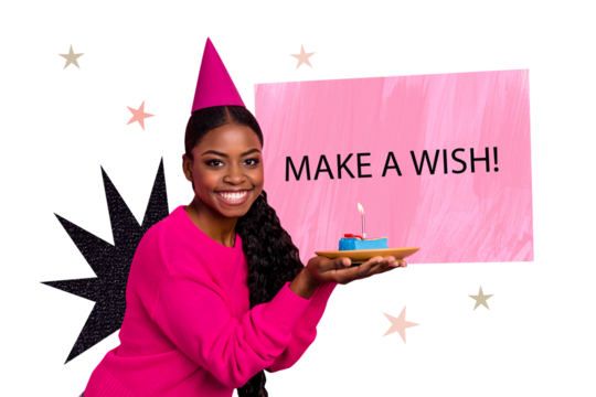 Composite photo collage of happy american girl hold pie piece sweet cake plate candle make wish birthday isolated on painted background