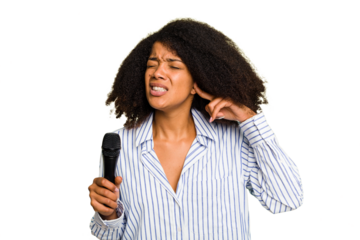 Young African American singer woman holding a microphone isolated covering ears with hands.