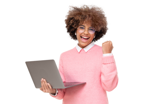 Winner! Excited smiling african girl with laptop, raising one hand in the air is she wins